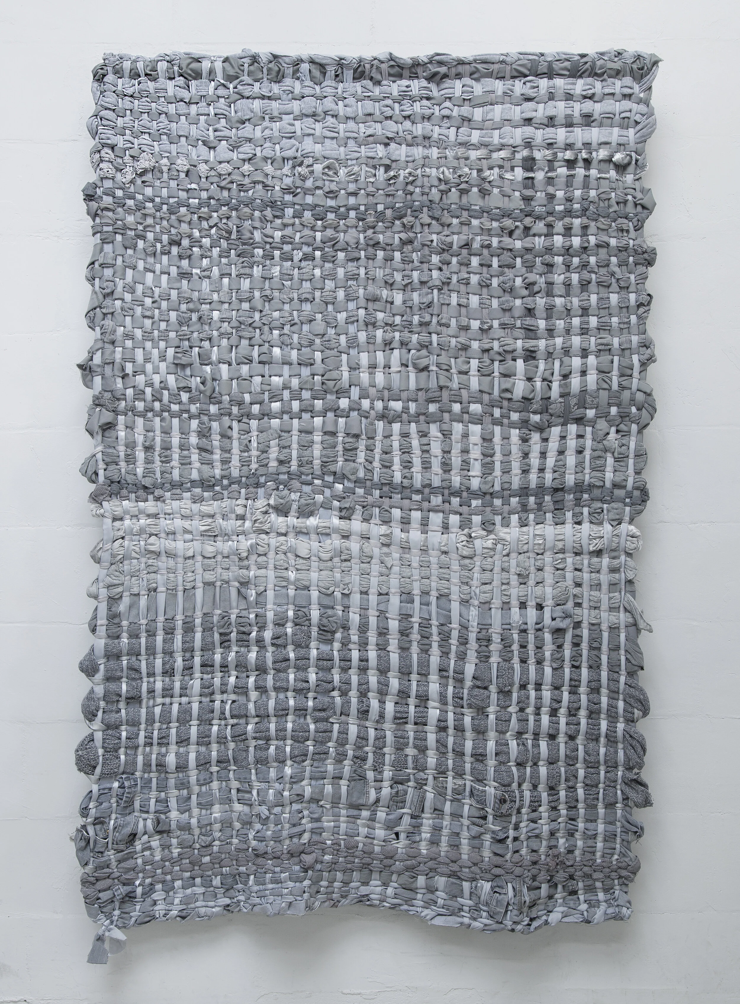 A bright moon lights the world in shades of grey and silver. That fromed the inspiration for this work. How moonlight shines on several surfaces. makes them shimmer, fade in to the background or barely visible because of the dissolving in darker greys. The piece is very still, the weaving technique is graphic, but the different textures of the used recuperated fabrics form an irregular order. It adds softness to a room, making it restful and quiet, like real moonlight.